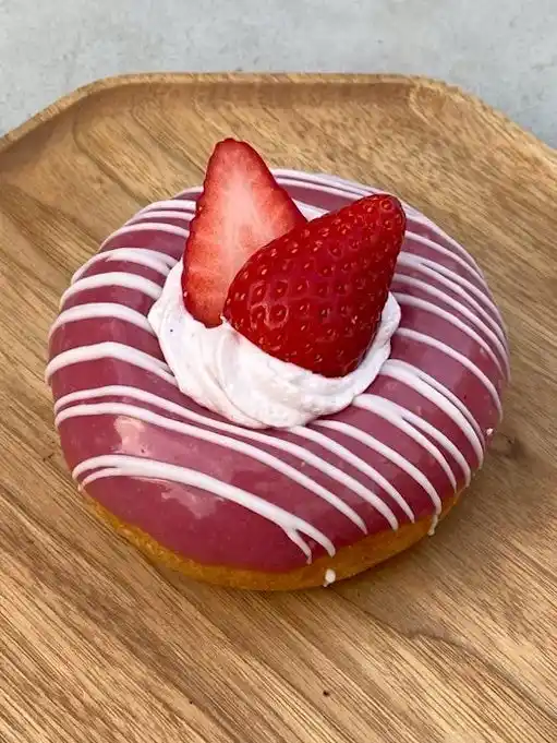 もちもち生地の揚げドーナッツに甘酸っぱいフランボワーズグラサージュとホワイトチョコを重ね、苺クリームの上にフレッシュの苺をのせました。バレンタインのギフトにもおすすめの一品です。 |