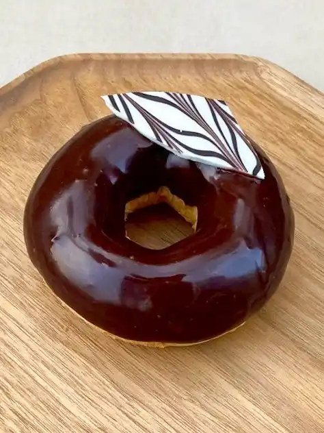 もちもち生地の揚げドーナッツにチョコレートグラサージュを合わせた、シンプルな仕上がり。マーブルチョコがさりげないアクセントになっています。 |