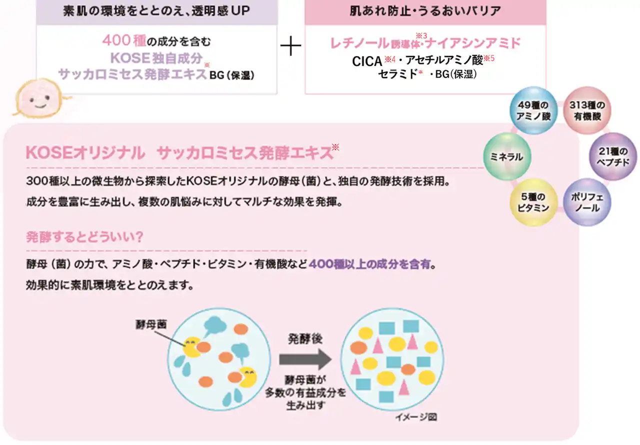スキンケアで大きなトレンドとなっている「発酵」に着目し、KOSE独自成分「サッカロミセス発酵エキス※」配合の毎日使いやすい低刺激化粧水・乳液を発売いたします。日々の肌ストレス※1をケアし、素肌環境をととのえ、もっちり透明感のある肌へみちびきます。 |