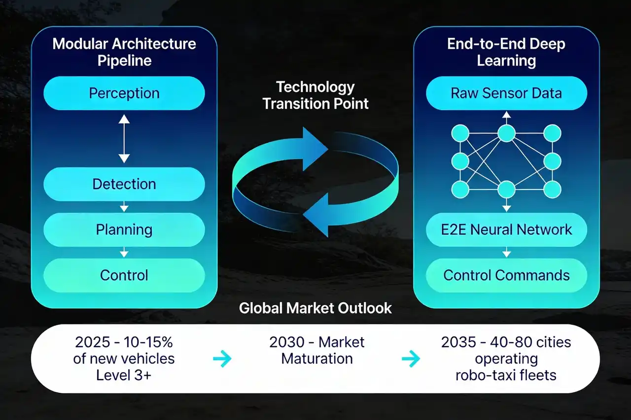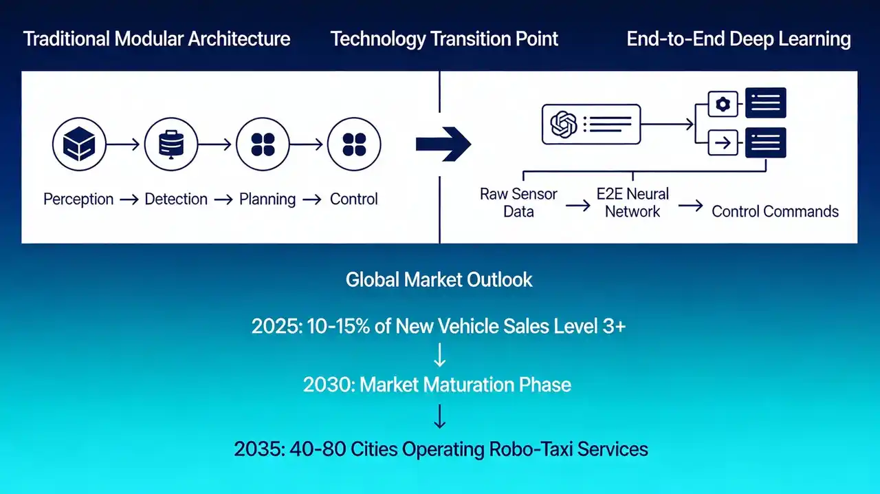 | 特に、エンドツーエンド深層学習への技術転換、ロボタクシー商用化の加速(2035年までに40~80都市)、電動化との統合、ならびに次世代チップ・AI処理能力の向上が、市場拡大の主要なドライバーです。 | |||||||||||||||||||