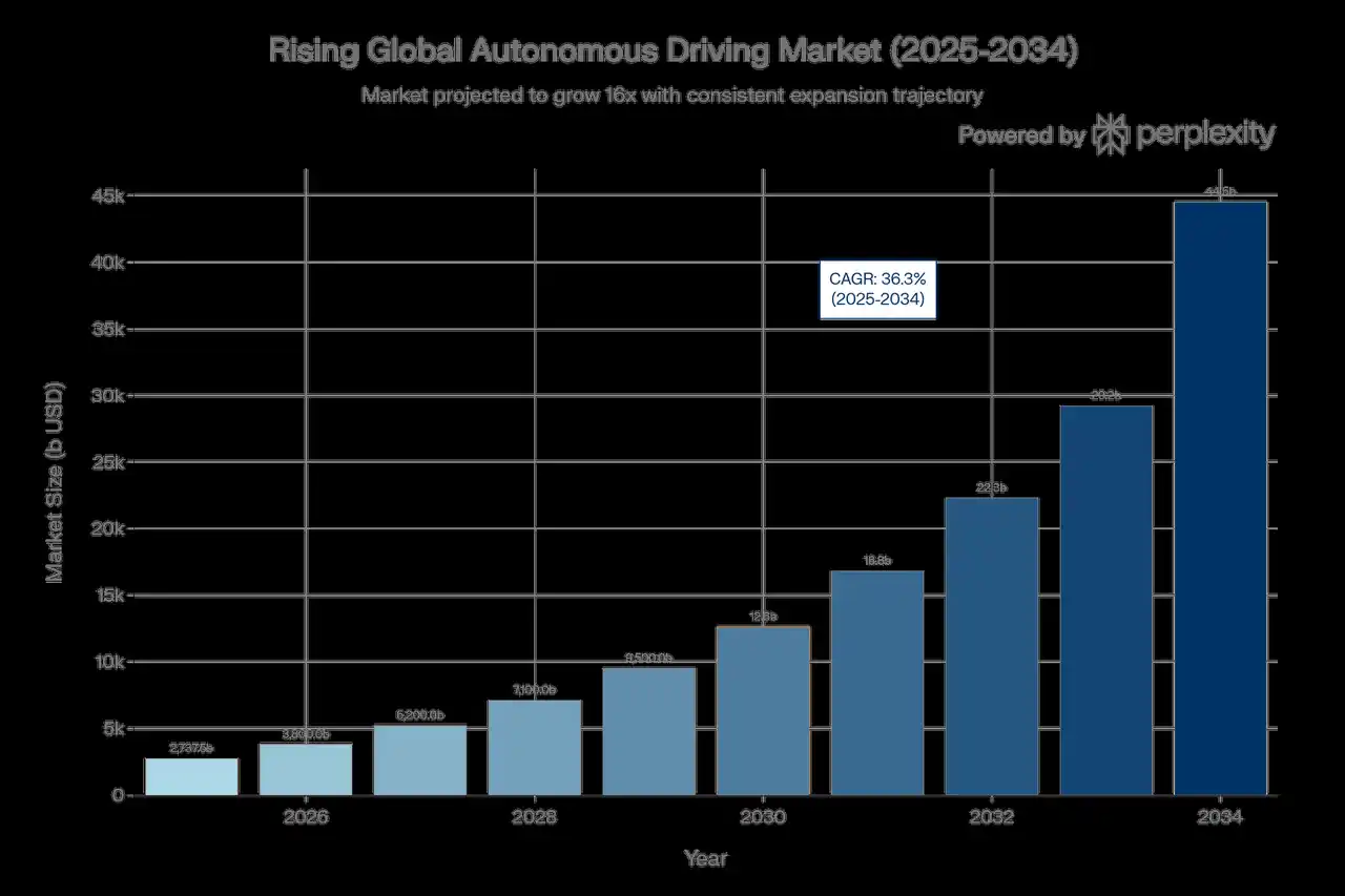 | 2025年から2035年にかけて、世界の自動運転市場は年平均成長率36.3%で急速に拡大し、市場規模は2.7兆ドルから44.5兆ドルへと16倍以上に成長することが確実です。 | |||||||||||||||||||
