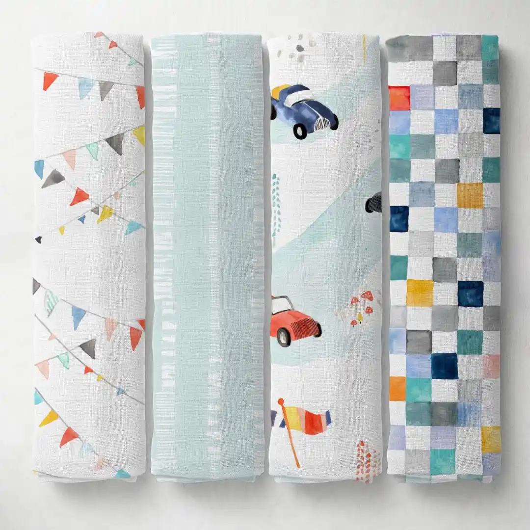 安心して赤ちゃんにご使用いただける素材、モスリンコットン。縦糸と横糸を優しくていねいに平織りしたモスリンは通気がよく、ふんわりと柔らかい肌ざわりが魅力です。シーンや気分で使い分けて楽しい、バリエーション豊富なデザインで、パパママの嬉しいポイントを押さえました。もちろん洗濯機で簡単にお手入れ可能。洗うたびにふんわり心地よい肌ざわりで、長くご愛用いただけます。 |