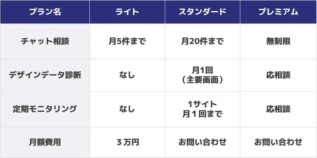 本サービスは、月額定額制で、専門家によるデザインデータの診断や、チャットツールを通じた日常的な相談対応を提供するものです。プロジェクト単位にご依頼いただくものではなく、日々の運用における「予防」と「維持」に特化した継続型のサービスです。 これからアクセシビリティ対応を始めたい企業様や、制作会社に依頼しつつ自社でも品質を管理したいWeb担当者様に最適です。 |
