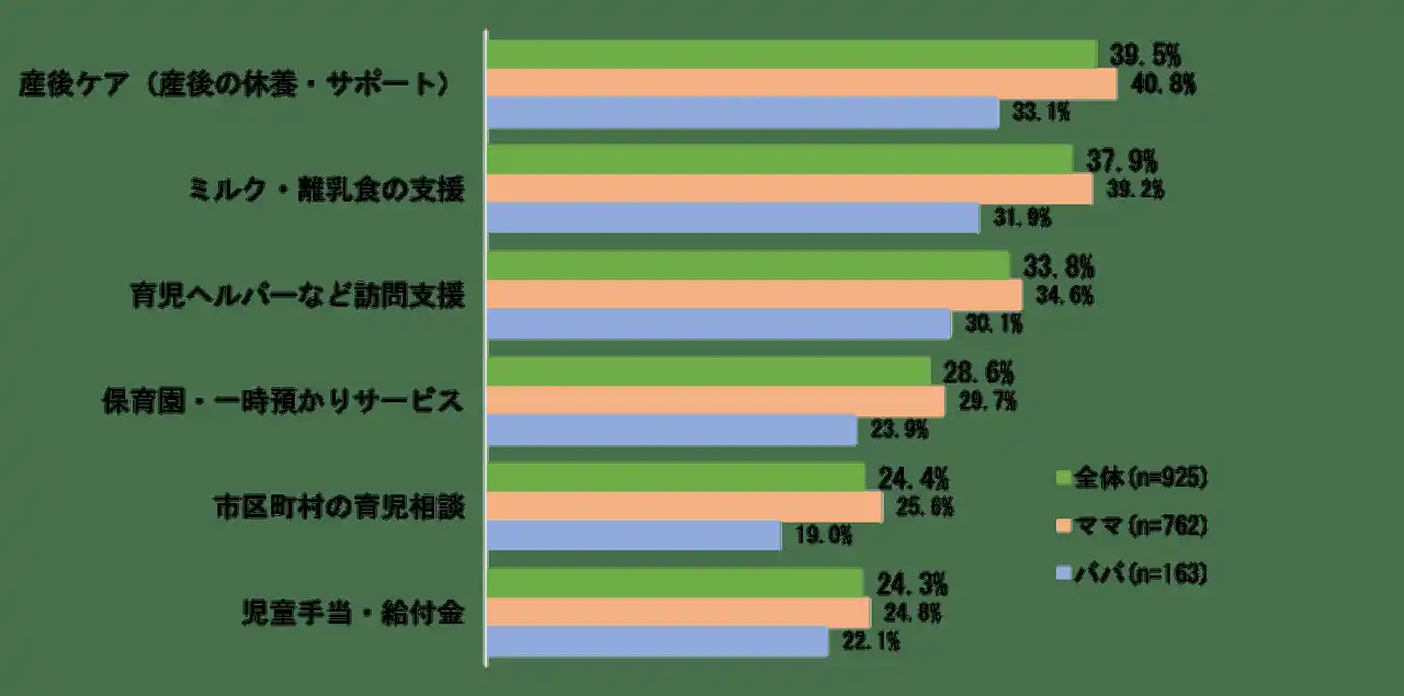 一方で、「トモイク」を実現する上で重要な国や地域・企業が提供する制度やサービスにおいて、知られていない支援も多く、「産後ケア」「ミルク・離乳食の支援」「育児ヘルパーなど訪問支援」はそれぞれ3人に1人が「出産前によく知らなかった」と回答しています。特に「産後ケア(産後の休養・サポート)」はママの40.8%が「よく知らなかった」ものの、32.9%は「思ったより役に立った」支援と感じています。 |