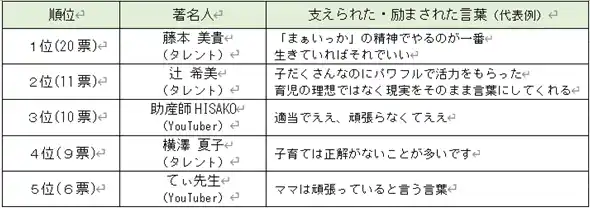 さらに、「支えられた・励まされた」著名人の言動として、タレントの藤本美貴さんに関するエピソードが20件も寄せられました。「子育ては“まぁいっか”の精神でやるのが一番」「育休中にキャリアが止まることはしょうがなくない?」「生きていればそれでいい」といった発言に共感し、励まされた方が多いようです。 |