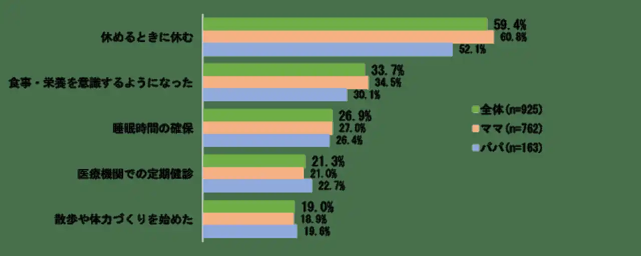「トモイク」の浸透による「体の負担軽減=健康」についてはどうでしょうか。今回、子育てを通じて約8割(79.6%)が「ウェルビーイング(心と生活の幸福感)が高まった」と回答しました。しかしながら現状、「健康(食事・運動・睡眠)」に関しては32.4%が「子ども優先でおろそかになった」と感じ、特にママはパパよりも7.3ポイント高い3人に1人(33.7%)がご自身の健康よりも“子育てファースト”になりがちな傾向が伺えました。その中でもママ60.8%・パパ52.1%ともに「休めるときに休む」を意識して乗り切っているようです。 |