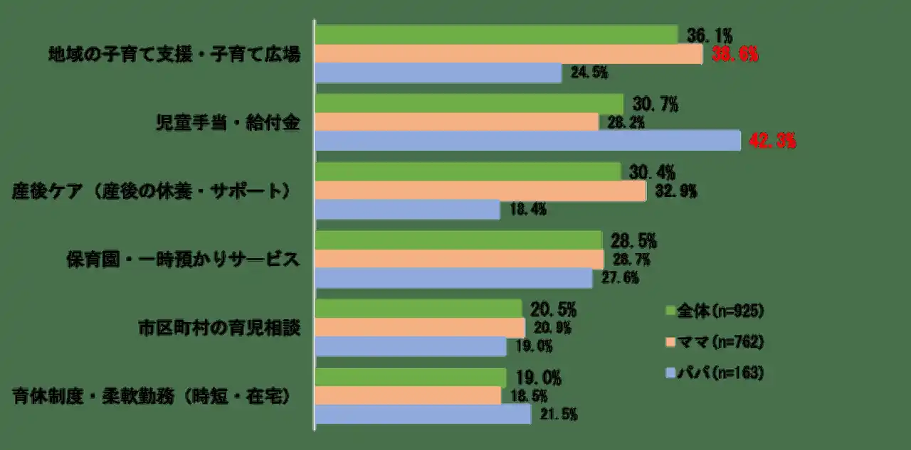 次に、社会からの子育て支援の観点から“愛情以外”に重要だと思う要素を聞いたところ、「体力」56.5%や「時間」54.2%を大きく引き離して、1位は「お金」77.5%という結果になりました。実際、パパの42.3%は「思ったより役に立った」支援として「児童手当・給付金」をトップに挙げています。ママからは「地域の子育て支援・子育て広場」が38.6%と高い数字になりました。 |