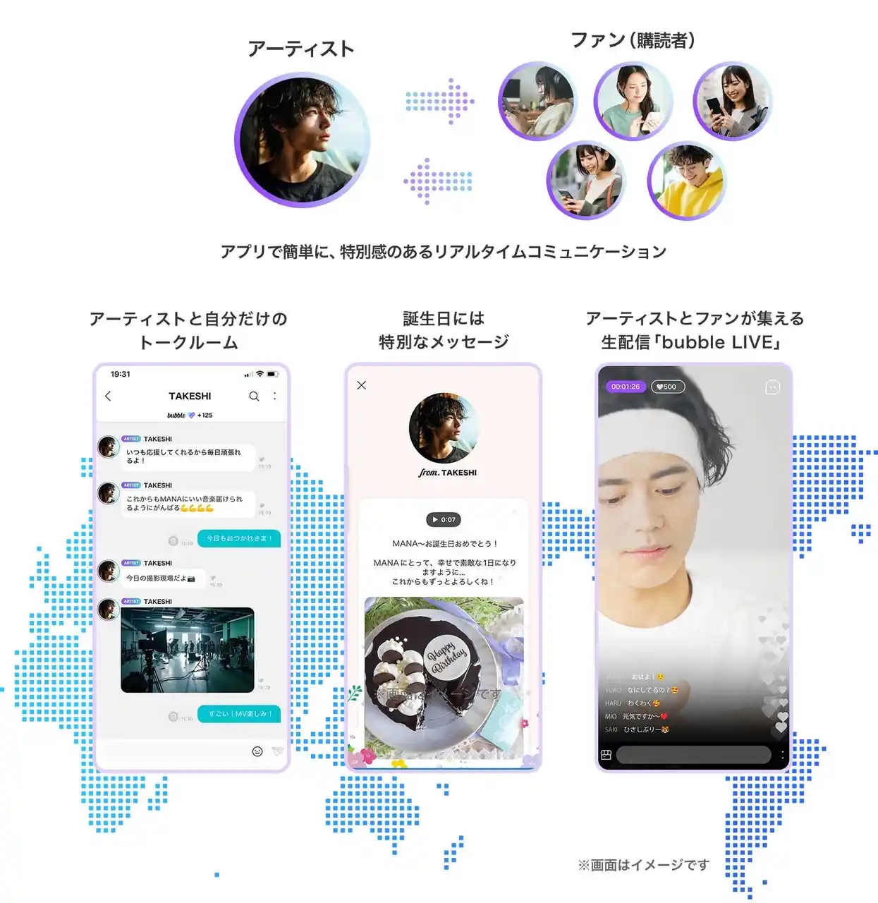 | 2024年6月にサービスを開始した「bubble for JAPAN」では、現在までに、Mrs. GREEN APPLE、渋谷すばる、Novelbright、MIYAVIといった音楽アーティストをはじめ、SKE48などのアイドルグループ、矢吹奈子、藤田ニコル、かす といったタレント・モデル・YouTuberまで、幅広いジャンルで利用されています。 | |||