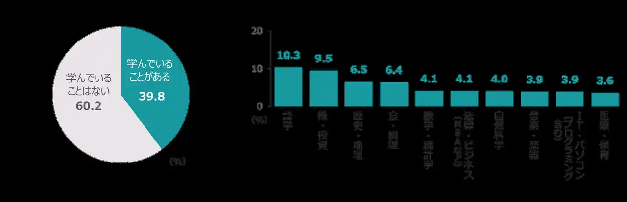 現在学んでいることがある人は39.8%。学んでいることは、「語学」「株・投資」がTOP2。今後学びたいと思っていることは、「語学」「株・投資」「歴史・地理」「IT・パソコン」「食・料理」が上位。<図2・3> |