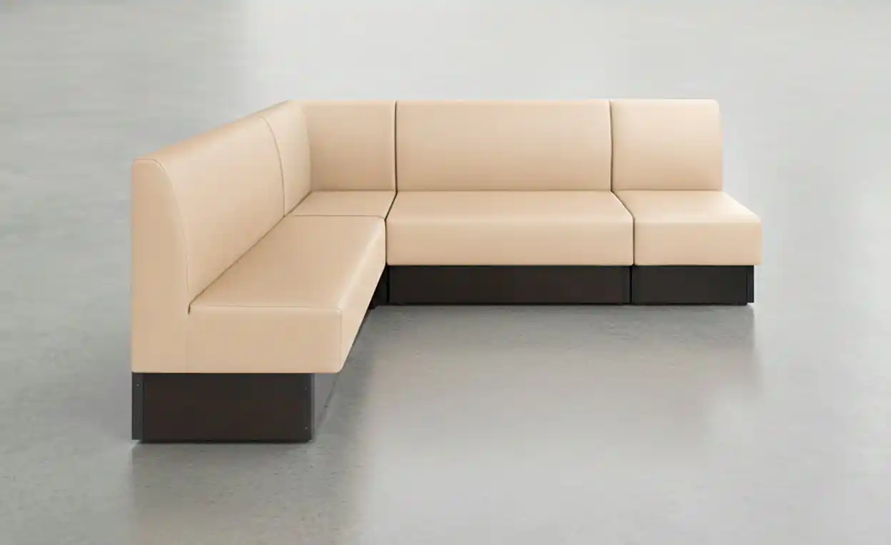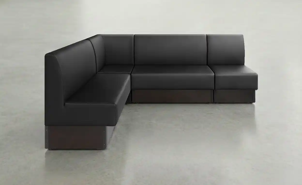 ソファの背面側も同素材のレザー張りを施し、どの角度から見ても、統一感のある仕上がりです。店内中央への配置ができ、様々なレイアウトに対応します。 |
