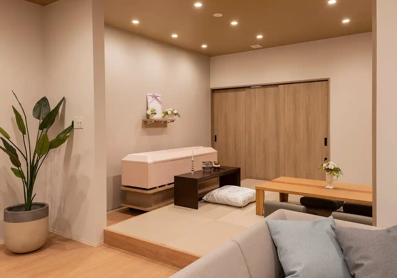 式場には自然光が差し込み、明るく温もりのある雰囲気を演出。 控室はご自宅のようにくつろげる空間とし、ご家族が気兼ねなく故人様を偲べるよう、静かでプライベート性の高い環境を大切にしています。 |
