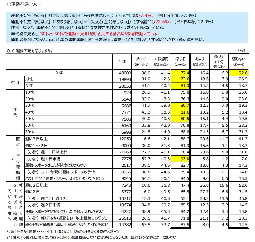 スポーツ庁が発表した最新の「令和6年度 スポーツの実施状況等に関する世論調査」によると、全体の77.4%が「運動不足を感じる」(※)と回答しています。 |