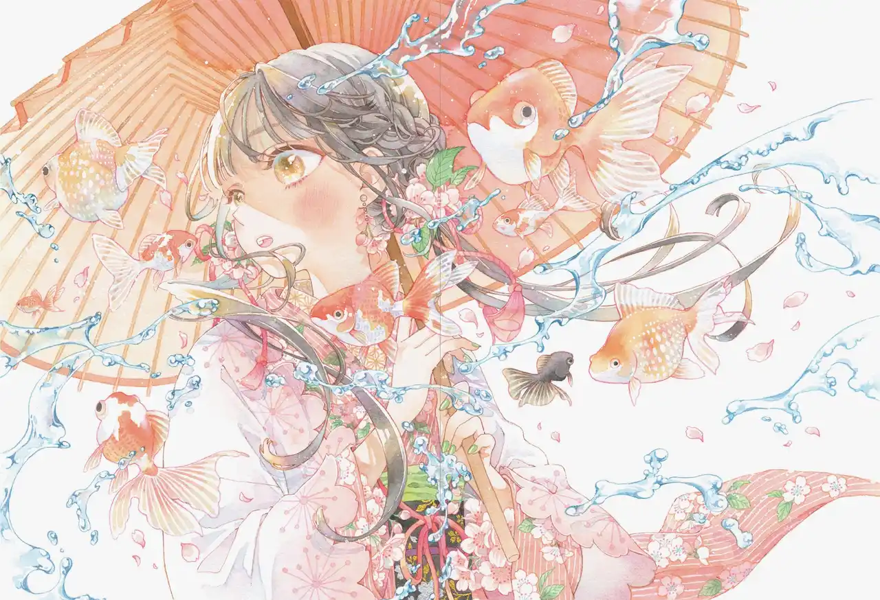 | ・着彩(肌/目/髪/傘/髪飾り/着物/帯/金魚) | ||||||||