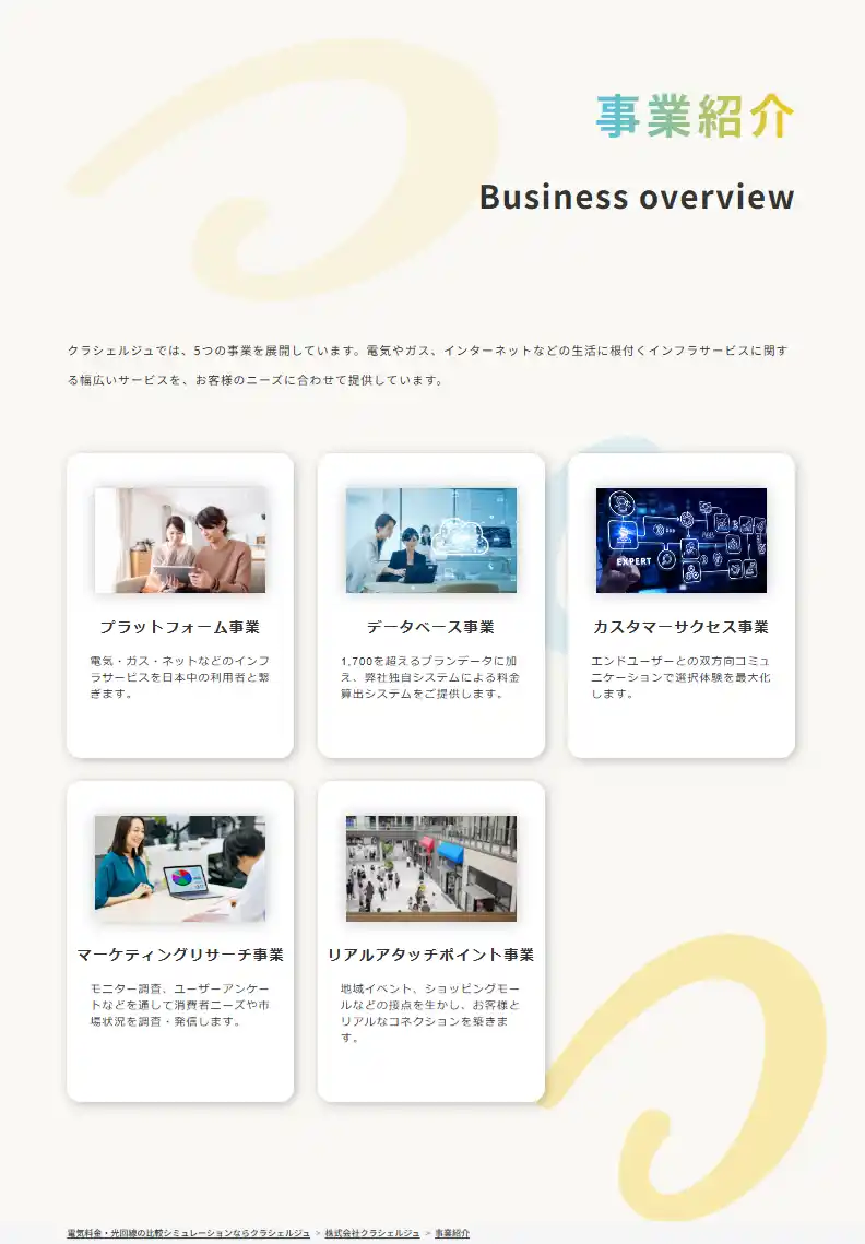 事業内容:生活インフラ比較プラットフォームの運営、データベース事業、カスタマーサクセス事業、マーケティングリサーチ事業、リアルアタッチポイント事業 |