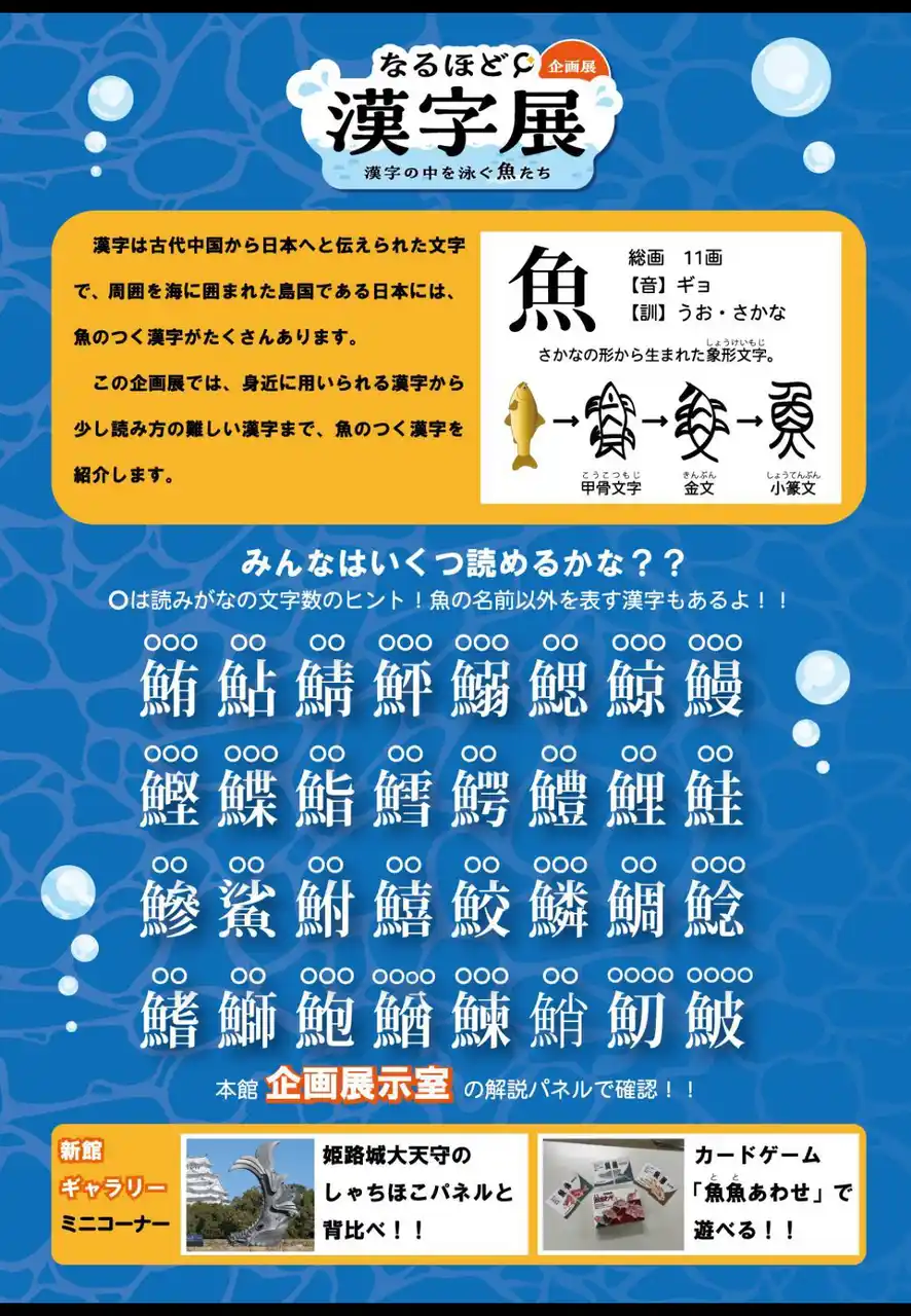 | 本企画展では、魚偏がついた漢字と、その漢字にあたる生物達について紹介します。 |