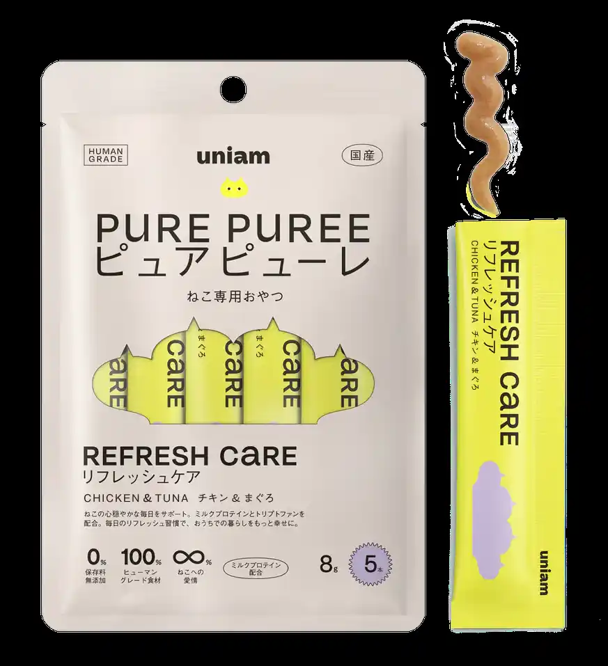 | 「ねこと生きるを、ユニークに。」をパーパスに掲げ、ねこ特化型ヘルスケアブランドを展開する株式会社uniam(本社:東京都港区、代表取締役CEO:杉本亜衣、以下当社)は、健康ケアに特化したねこ用おやつ「ピュアピューレ」シリーズの「リフレッシュケア」のレシピをリニューアルします。 | |||||||||||||