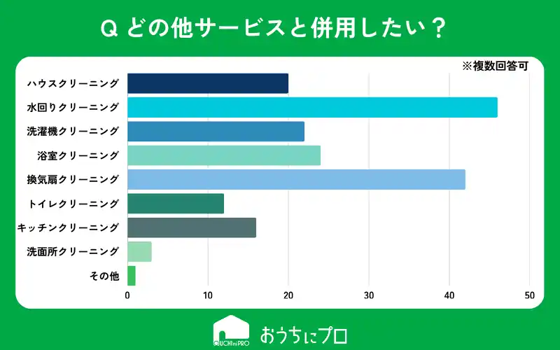 エアコンクリーニングとの併用を望まれているのは「水回りクリーニング」「換気扇クリーニング」が突出して多かった。 |