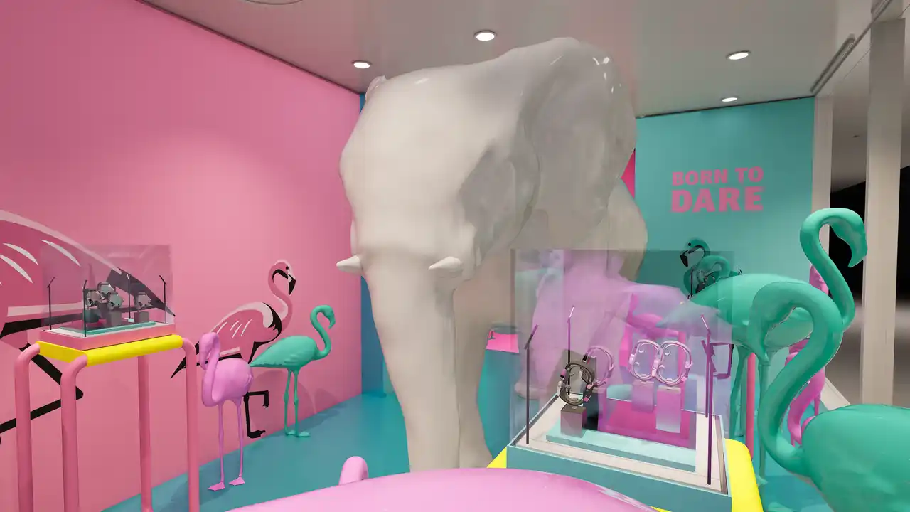 2025年7月18日(金)から8月5日(火)までの期間、DOVER STREET MARKET GINZA の象徴的な「エレファントスペース」は、ビビッドなピンクとターコイズブルーに彩られ、幻想的かつ刺激的な空間に生まれ変わります。エレファントを囲むように自由気ままに佇むのは、ピンクとターコイズブルーのフラミンゴたち。それは、ブランドのDNAに刻まれた「型破りの美学」を体現するエクスクルーシブなモデル群、「DARING WATCHES(デアリングウォッチズ)」の中でもとびきり目に楽しいモデル、「ブラックベイ クロノ “ピンク”」と「ブラックベイ クロノ “フラミンゴブルー”」がつくりだす、ユニークな世界観です。 |