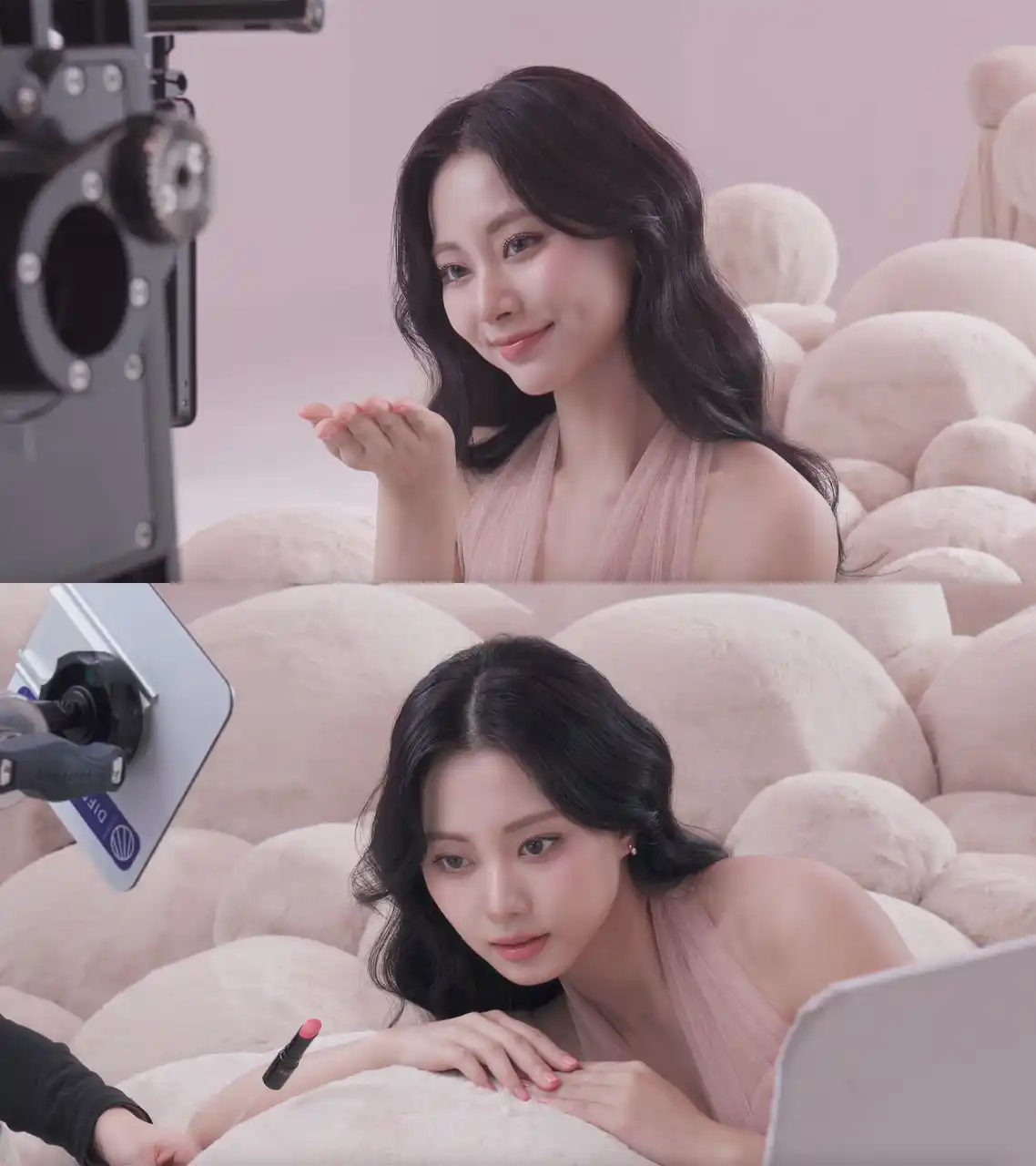 透明感あふれるピンクのワンピースで登場したツウィさん。雲のようにふわふわとしたベッドに身を預け、気持ちよさそうに眠るシーンから撮影がスタート。まどろむようなやわらかな表情やそっと動く手元の仕草に、スタジオはリラックスしたムードに包まれ、撮影は順調に進みました。 |