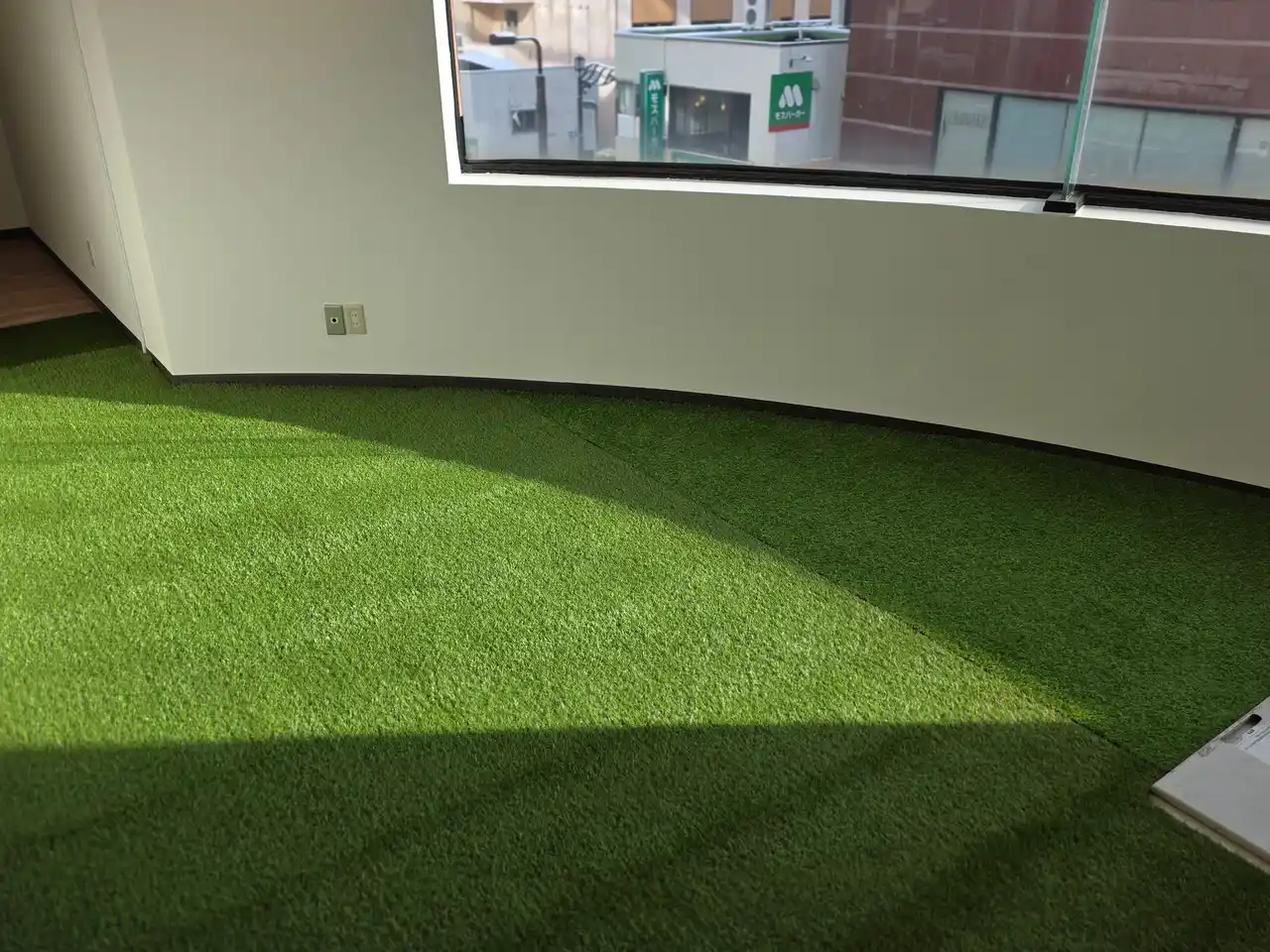 靴を脱いでリラックスできる芝生エリアを完備。長時間のデスクワークで凝り固まった脳と身体を物理的にリセットできる空間です。 |