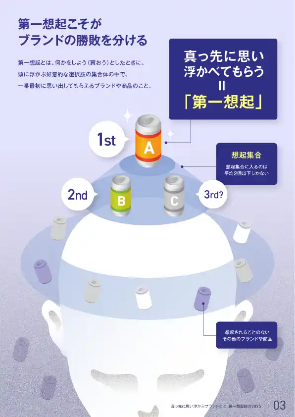 トライバルメディアハウスが調査した『第一想起白書2025』では、想起集合に入るブランドは平均2個以下という前提のもと、真っ先に思い浮かべてもらう「第一想起」の重要性を整理しています。 |