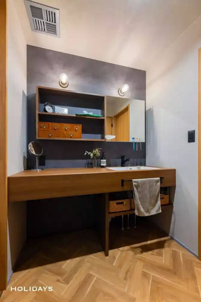 ディスプレイ感覚で使えるオープン収納に加え、ミラー内部にも収納スペースを設けることで使い勝手も抜群。背面はダークグレーの壁でアクセントを加えて意匠性の高い空間に。 |