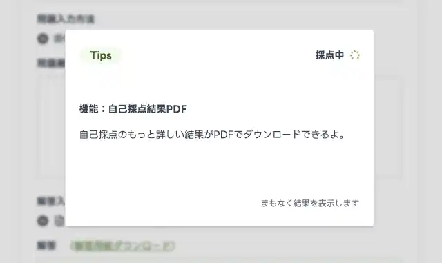 自己採点のもっと詳しい結果がPDFでダウンロードできるよ。 |