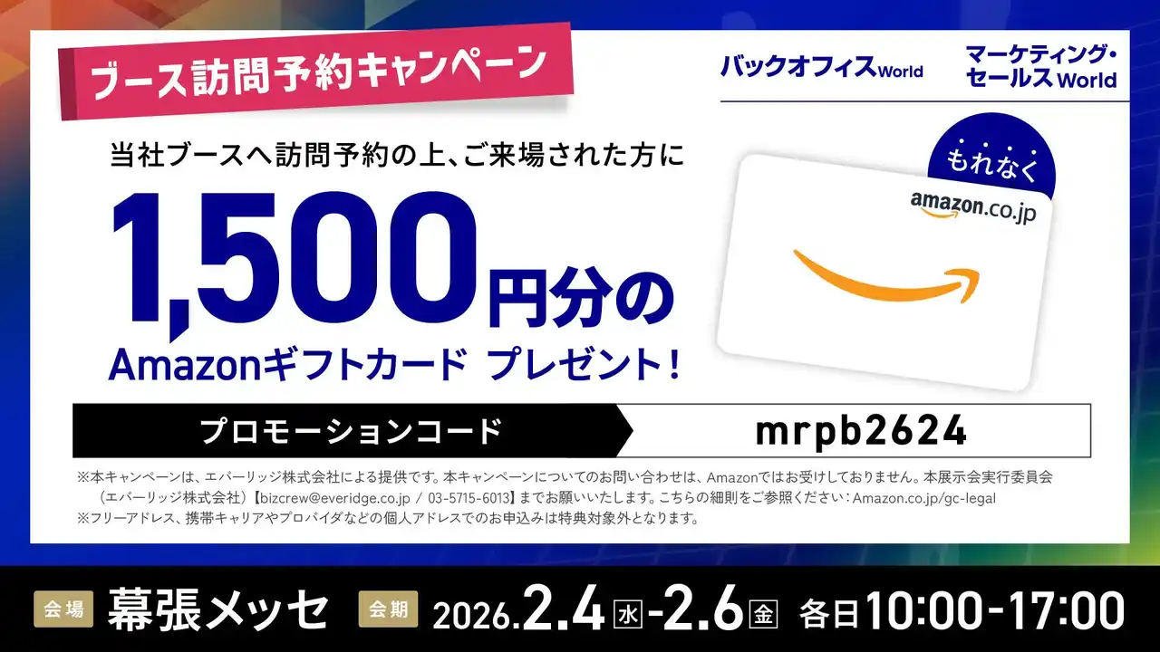 展示会に来場のうえ、アポイントを実施すると、後日主催者よりAmazonギフトカード1,500円分をプレゼント