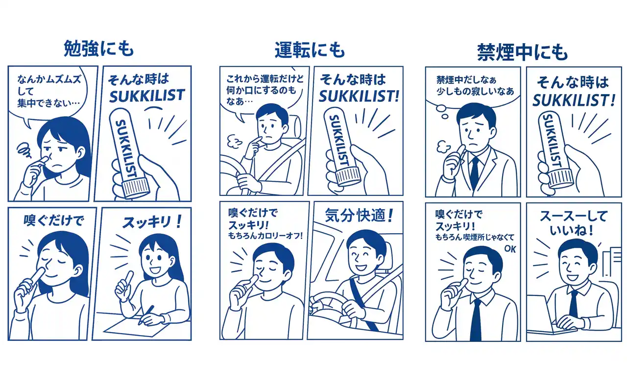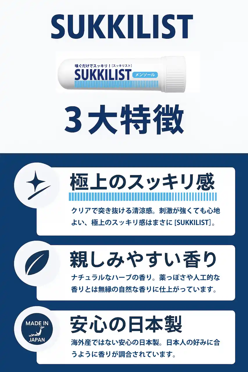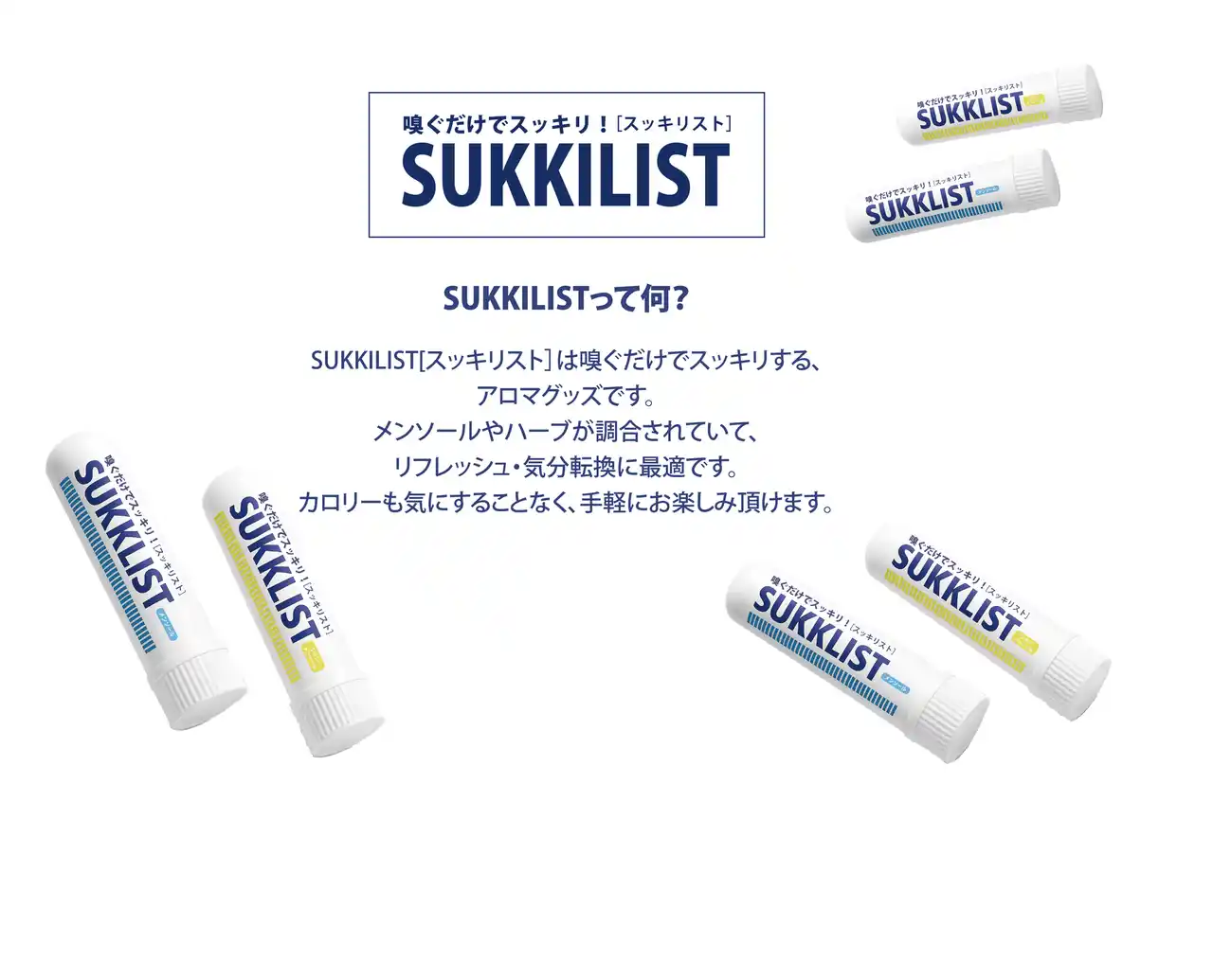 SUKKILIST[スッキリスト]は嗅ぐだけでスッキリするアロマグッズです。 メンソールやハーブが調合されていて、リフレッシュ・気分転換に最適です。 カロリーも気にすることなく、手軽にお楽しみ頂けます。 |