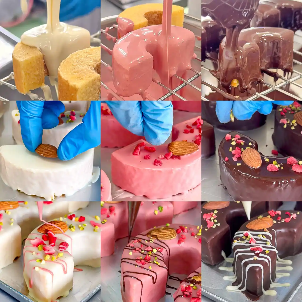 さらに、大粒のアーモンドをのせ、フリーズドライ苺とピスタチオもふんだんにトッピング。仕上げに、それぞれのフレーバーに合わせたチョコレートをライン状にあしらえば、見た目にも華やかな「ミニョンバウム」が完成します。 |