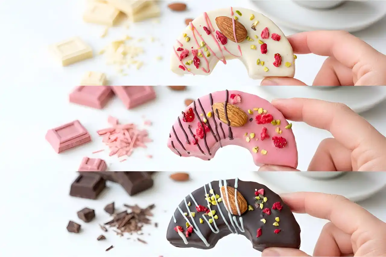 ホワイト・ストロベリー・ビター、それぞれ異なるチョコレートをまとわせ、アーモンド、フリーズドライ苺、ピスタチオでひとつひとつ丁寧にデコレーションしています。 |