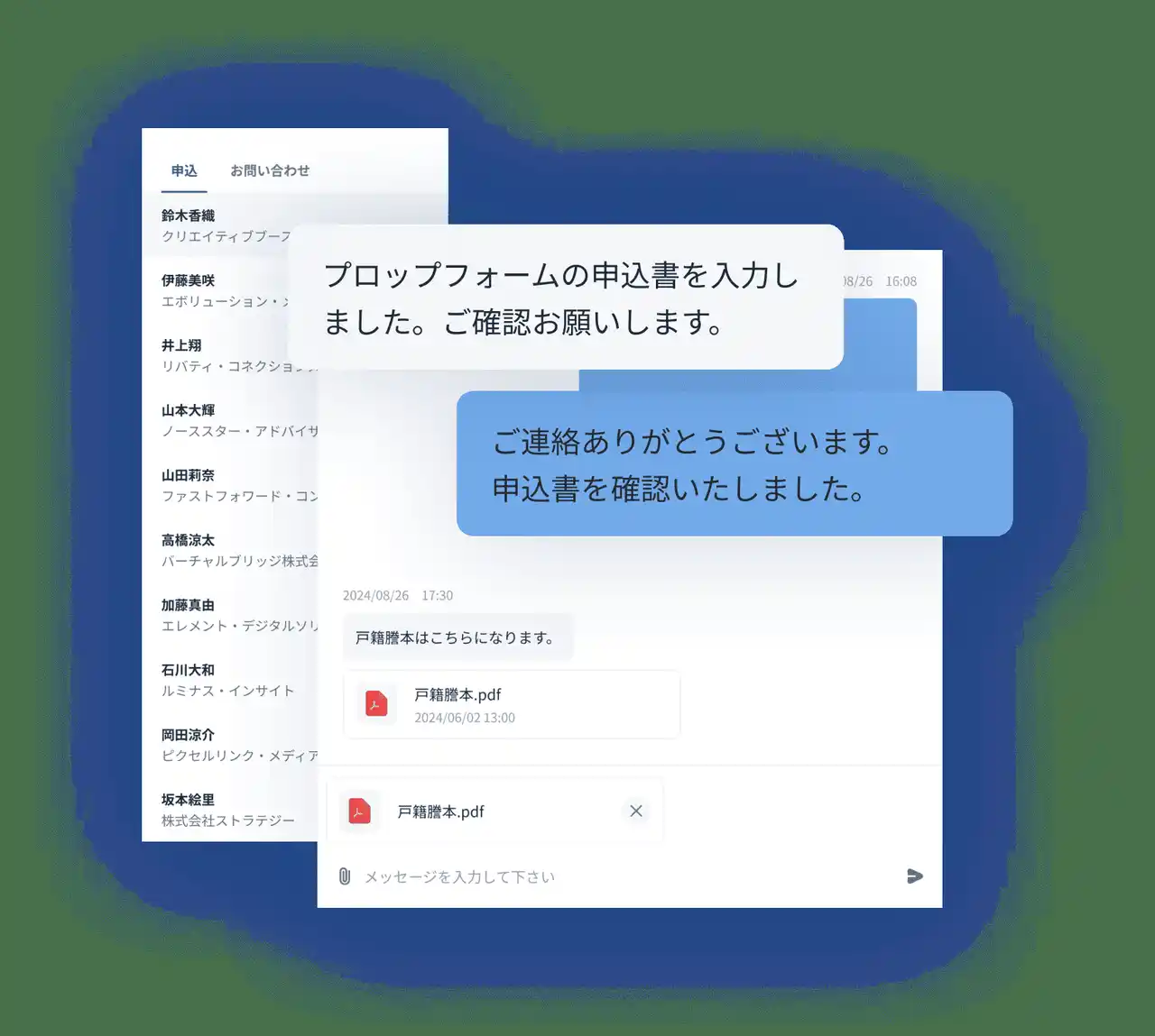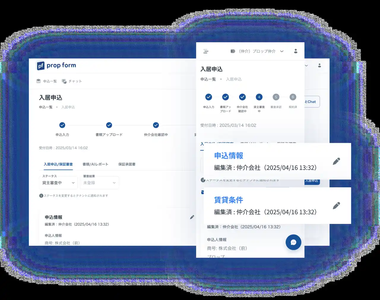 本機能は、プロップフォームの入居申込機能と連携することで、申込から入居審査までのすべての手続きをWeb上で完結できます。 |