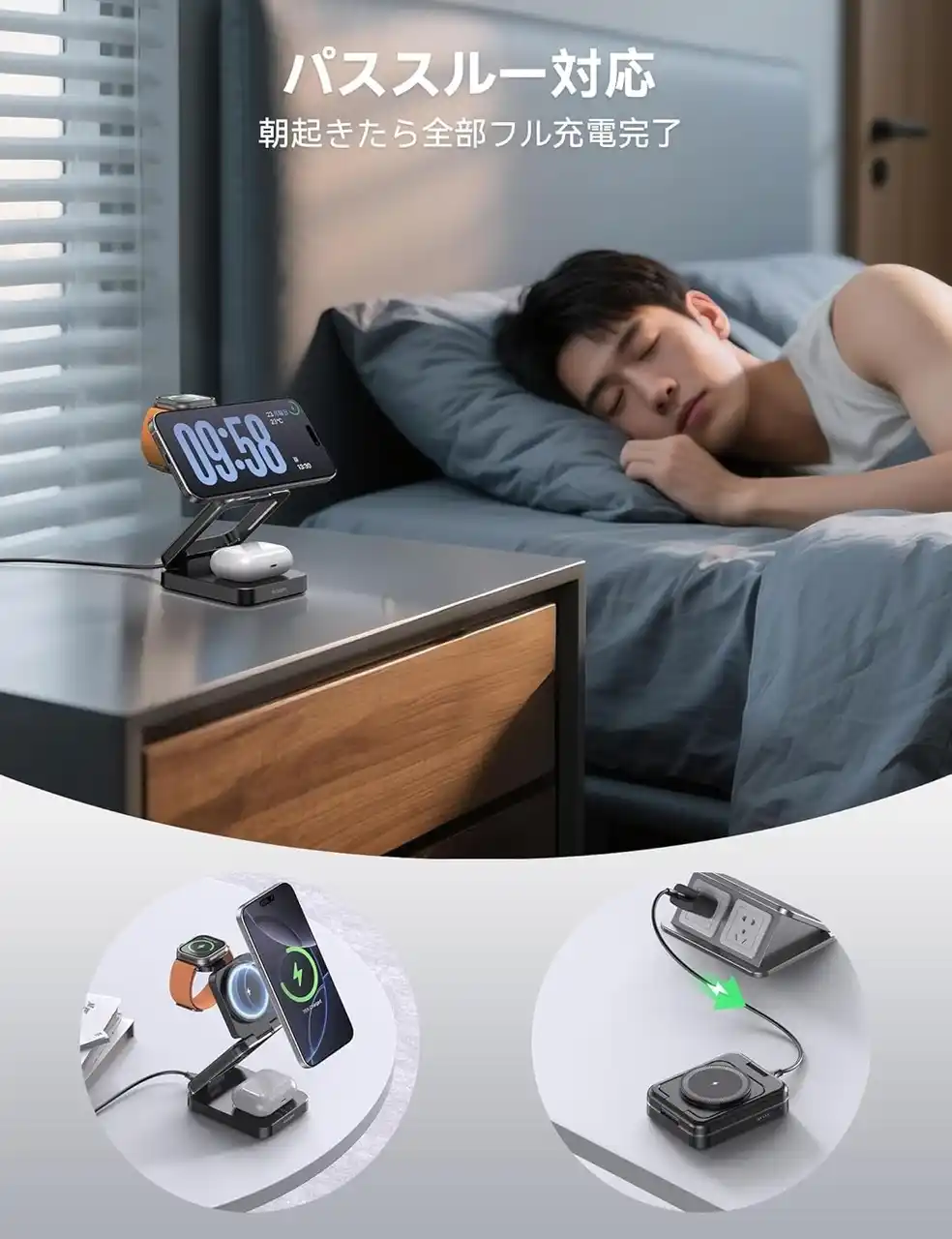 4. パススルー機能対応で“夜間充電→朝満タン”を実現 D17はパススルー充電対応。夜間、充電器本体を充電しながら3台のデバイスにも同時給電でき、朝起きたときにはすべてが満充電という快適な日常をサポートします。 |