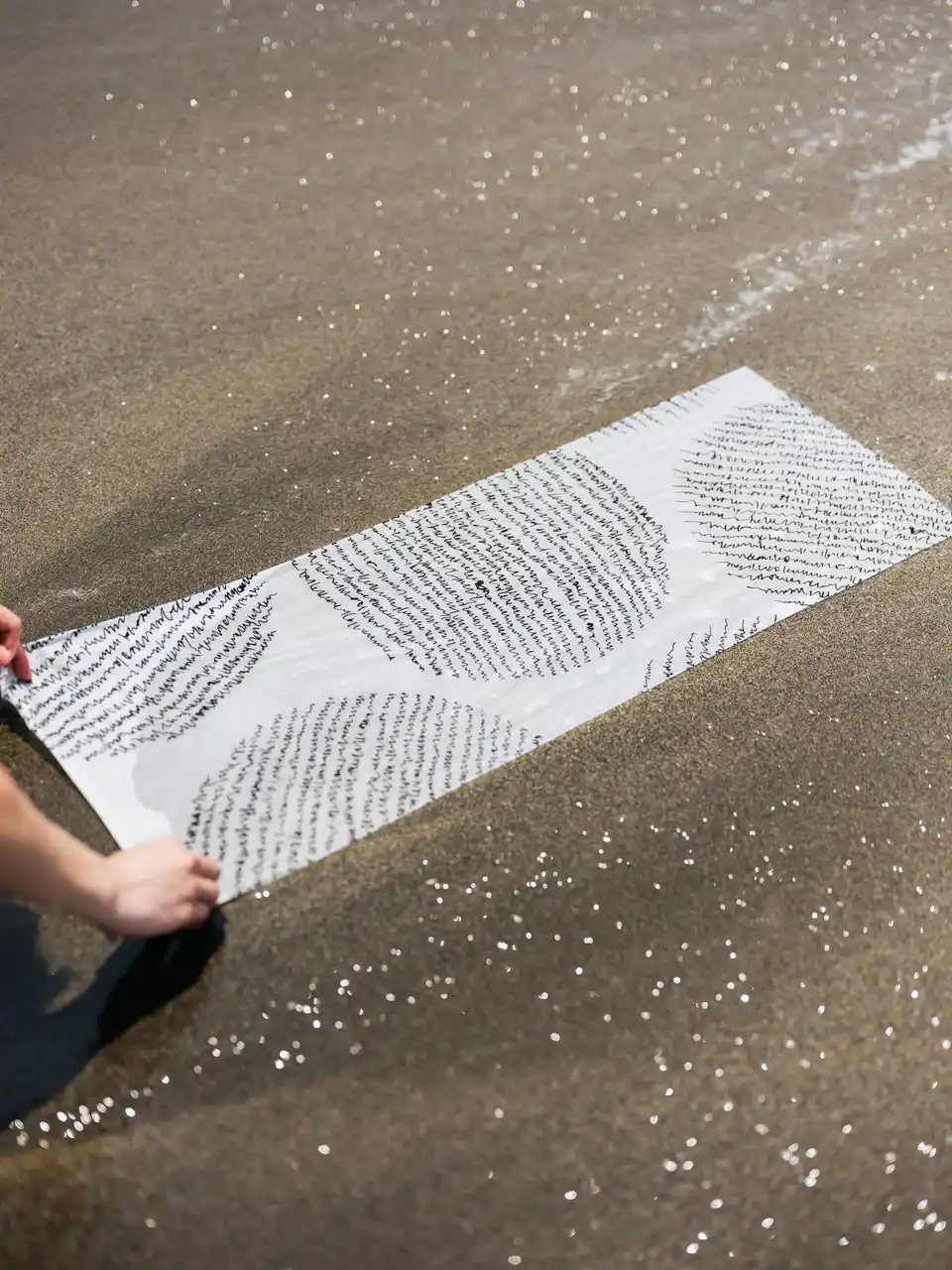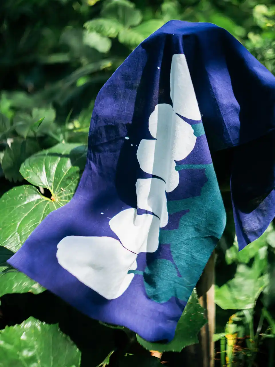 また、今回の浴衣と同じアートを用い、手捺染で仕上げた手ぬぐいもあわせて発売いたします。日常の中でもアートを気軽に楽しんでいただけるよう、使い勝手のよいサイズ感と素材で仕上げました。首元に巻いたり、額装したりと、自由な発想で暮らしに彩りを添えていただけます。 |