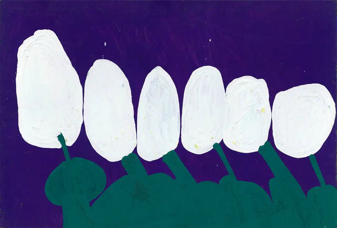 モチーフを見ながらアクリル絵具で描くというのが彼の制作スタイル。長年、花をモチーフに描いており、近年は一つの花にこだわり何カ月も同じ花を描き続けることがある。色や形を単純化して構成する画面の構成力も魅力である。太筆で描き進める作品は愛らしく、見る人を優しい世界へ連れて行く。一方、マジックペンで大胆に表現されるオリジナルの「福井フォント」が使われた作品は凛然とした雰囲気を纏い、見る人の目を惑わせる。 |