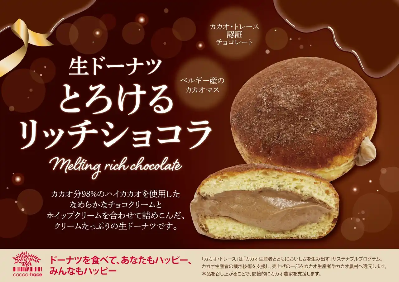 | この季節にぴったりなチョコフレーバーの生ドーナツが登場!カカオ分98%のハイカカオを使用したなめらかなチョコクリームと、ホイップクリームを合わせてたっぷり詰めこみました。 | ||||||||||||||
