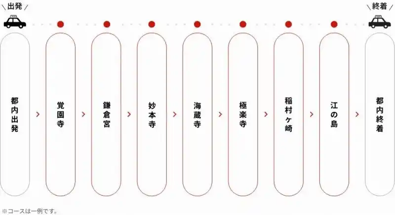 ※原則として平日の運行のみ承ります。土・日・祝日の運行も可能ですが、鎌倉周辺では交通規制があり周辺道路が大変混雑いたします。所要時間内でのご希望場所への訪問が難しい場合がございますので、予めご了承下さい。 |