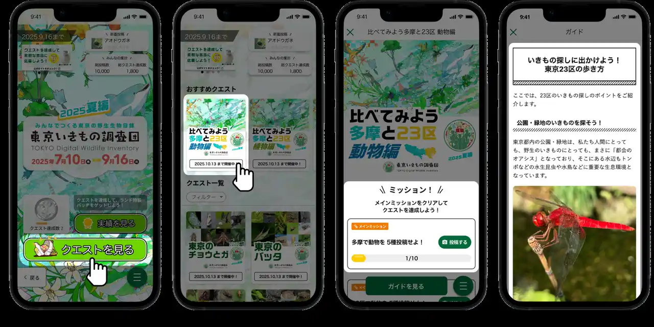 「ガイド」機能で、いきものの生態を楽しく学ぶ 各クエストには、対象のいきものの探し方のヒントが書かれた「ガイド」ページがあります。ページにはいきものに関する情報が詰まっているので、いきもの探しをしながら、東京の生態系について学ぶことができます。 リアルイベントで、「東京いきもの調査団」の成果を体験 |