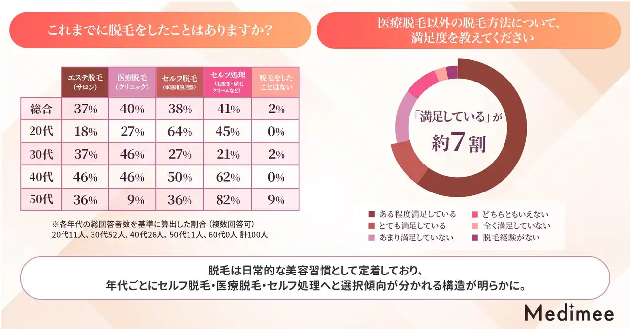 調査の結果、脱毛は日常的な美容習慣として広く定着しており、年代ごとにセルフ脱毛・医療脱毛・セルフ処理へと選択傾向が分かれる構造が明らかとなりました。 |