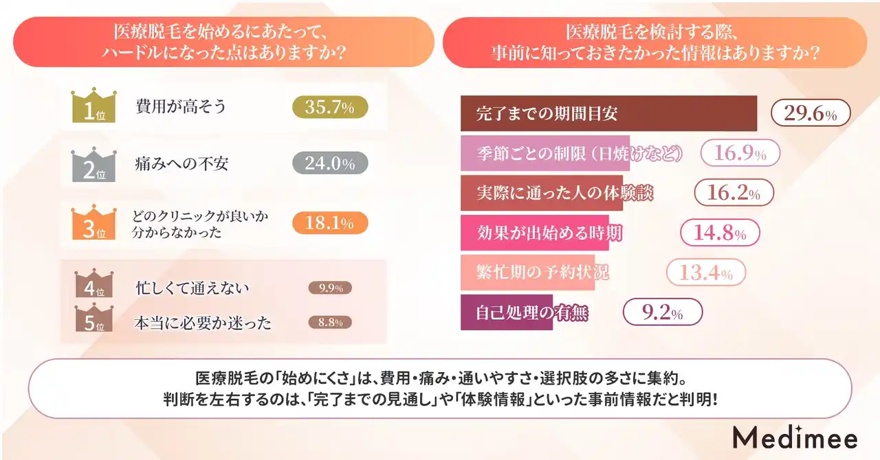 全体として、医療脱毛を始めるハードルは、「費用」「痛み」「通いやすさ」「クリニック選び」の4点に集約される構造が浮き彫りとなりました。 |