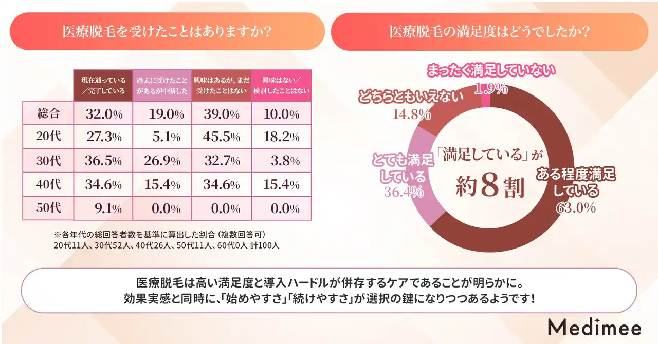 ■ 医療脱毛は「満足」が約8割超。一方で未経験(興味あり)は約4割と、関心と行動にギャップ |