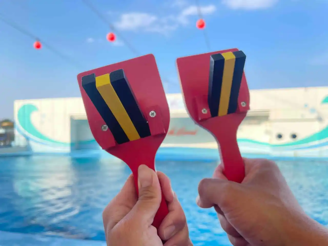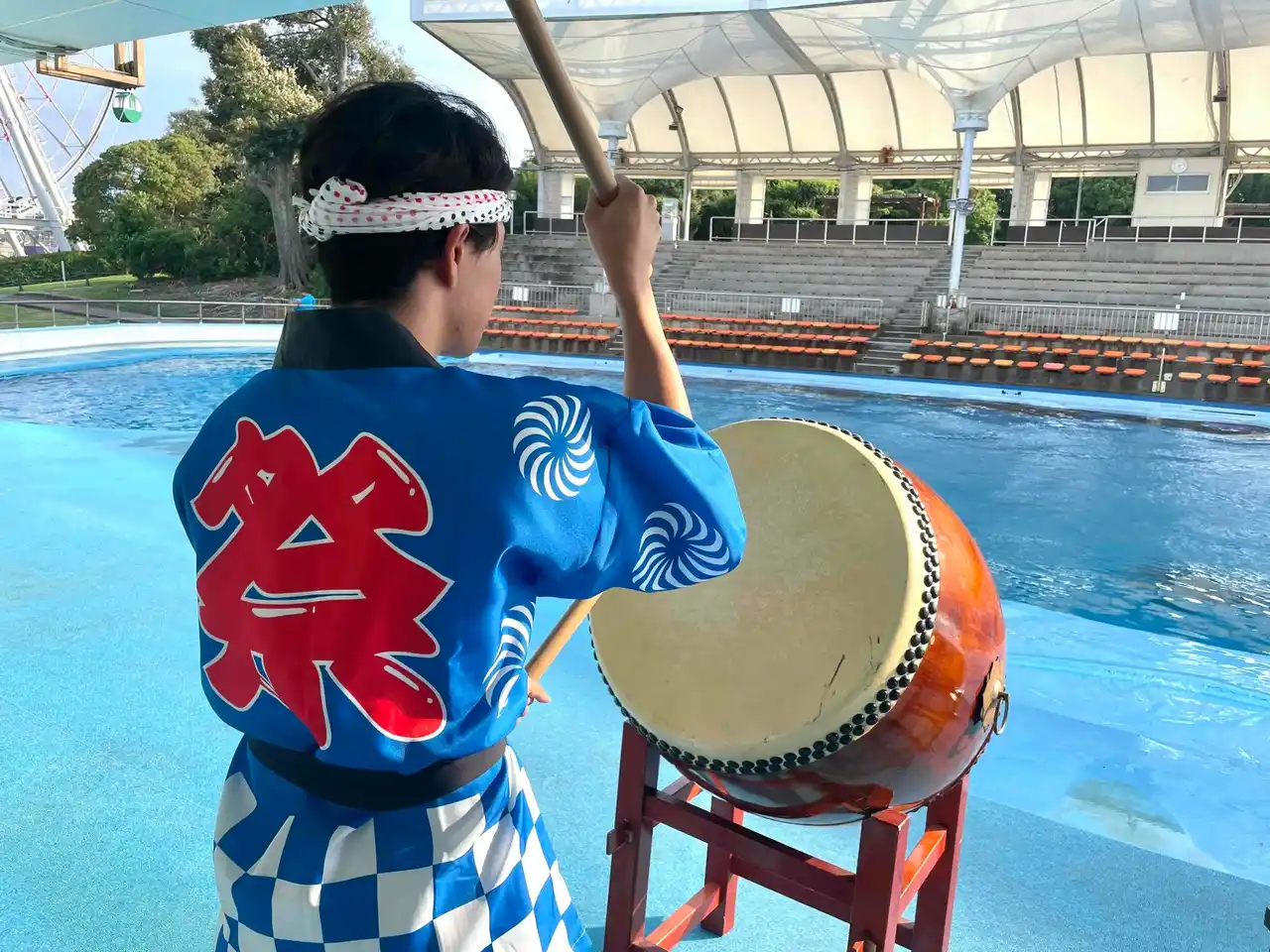| 夏のイルカショー「水涼の祭」は、お客様にも一体となってお楽しみいただける参加型のショーです。イルカたちの躍動感あふれるパフォーマンスに合わせて、迫力ある和太鼓の音色が会場を盛り上げます。さらに、お客様には鳴子を鳴らして参加していただく演出、およびソーラン節を取り入れた踊りで、スタジアム全体が日本のお祭りムードに包まれます。 | ||||||||