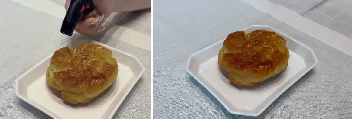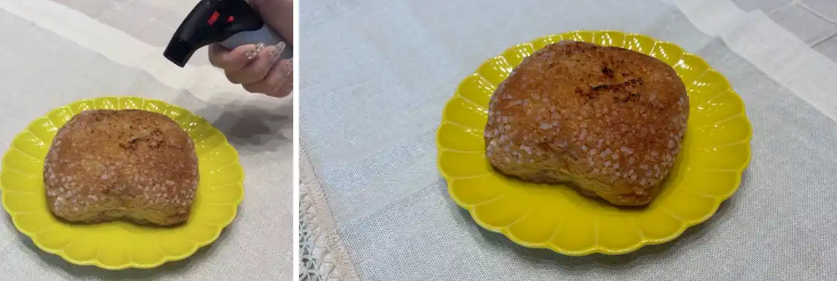 表面のザラメとバターがじゅわっと溶け、甘く香ばしい香りが食欲をそそります。外はカリッと、中はふんわりとした食感のコントラストが絶妙な「焼きたて」のようなリッチなスイーツになります。 |
