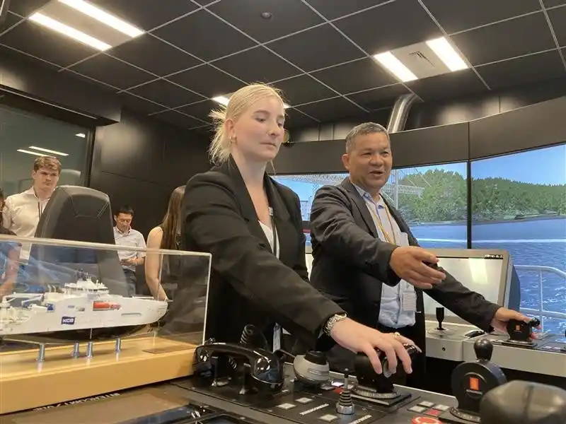 株式会社商船三井(社長:橋本 剛、本社:東京都港区、以下「当社」)は7月3日、社会貢献活動の一環として、オーストラリアの大学生(クイーンズランド工科大学から7名、ディーキン大学から6名、メルボルン大学とマッコーリー大学から各1名の計15名)を本社ビルに招待しました。当社概要および環境・安全学習、安全運航支援センター視察、操船シミュレータ体験と、いずれのセッションにおいても学生たちによる活発な質疑応答・意見交換が行われました。 |