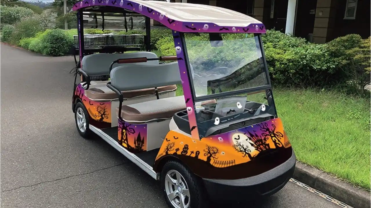 「Halloween」または「紅葉」デザインを施したラッピングゴルフカートの導入を始め、秋最大のイベントである“Halloween”演出として、限定デザインのピンフラッグを各ゴルフ場のNO.18ホールに設置することでホールアウトまで季節の演出がご堪能いただけます。 |