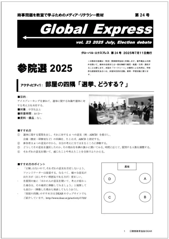 認定NPO法人 開発教育協会(DEAR)は、時事問題を教室で扱うメディア・リテラシー教材『グローバル・エクスプレス』第24号(2025年7月10日発行)を公開しました。今回は「参院選2025」をテーマに、選挙を通じて外交や防衛、多文化共生について考える2つのアクティビティを紹介しています。この教材は参院選2025に対応していますが、選挙が終わったあとでも「これからの社会や政治との関わり」を考える対話のきっかけとして活用できます。 |