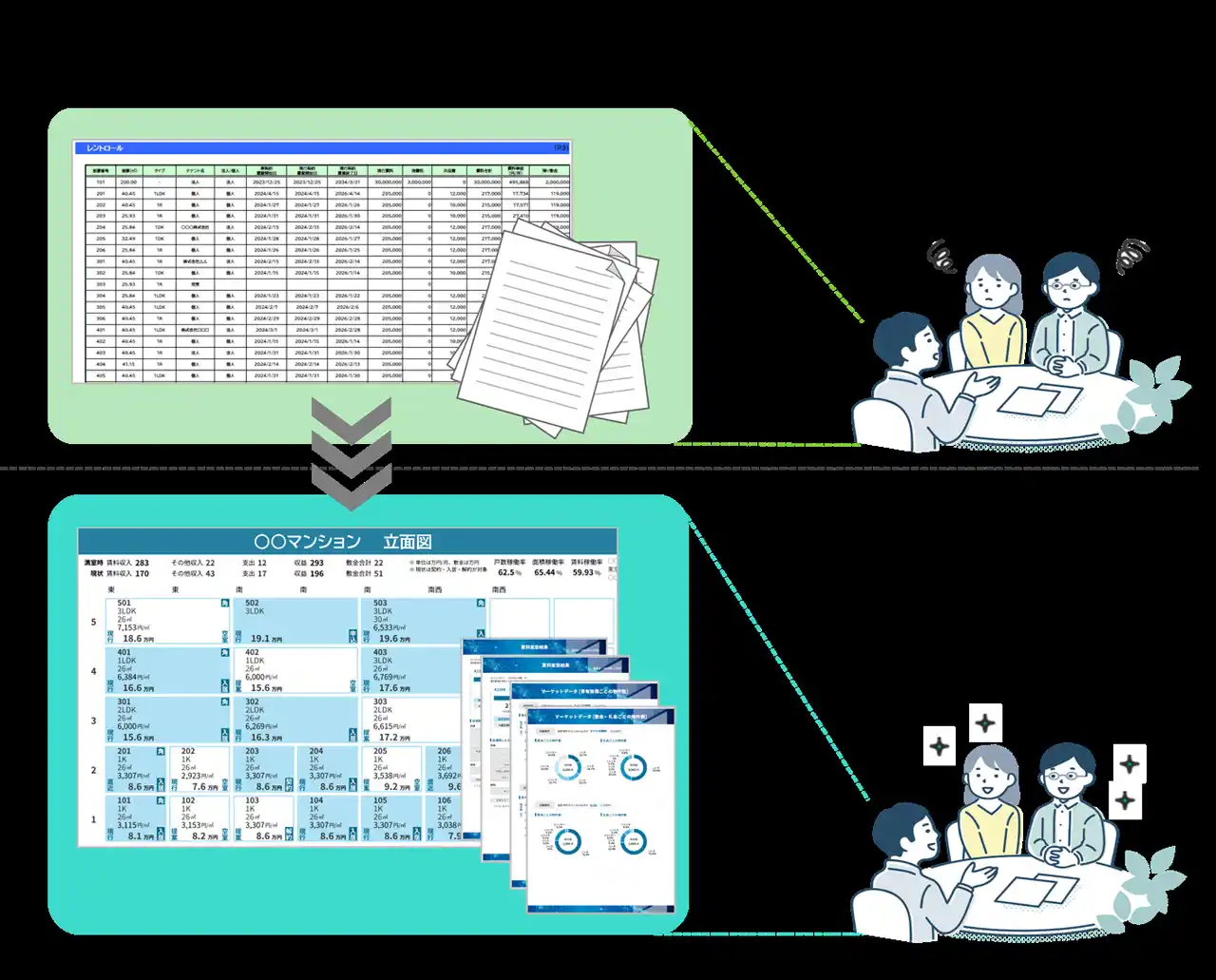 部屋構成および一棟単位での賃料と収益性を一目で把握できる資料として、新築・中古物件の仕入れ検討や社内共有に活用 |