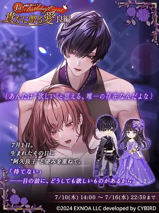 DMM GAMESを運営する合同会社EXNOA(本社:東京都港区、CEO:村中 悠介、URL:https://games.dmm.com/)は、Romanteen18シリーズの第1弾・オトナの女性向け恋愛ゲーム「夢幻楼と眠れぬ蝶」にて、良の誕生日を記念したゲーム内イベント「1st Birthday Event 貴方に贈る愛~良編~」と 「良Birthday記念ガチャ」を開催することをお知らせいたします。また、ゲーム内アイテムが当たるイベント連動キャンペーンを公式Xで開催することもお知らせいたします。 |