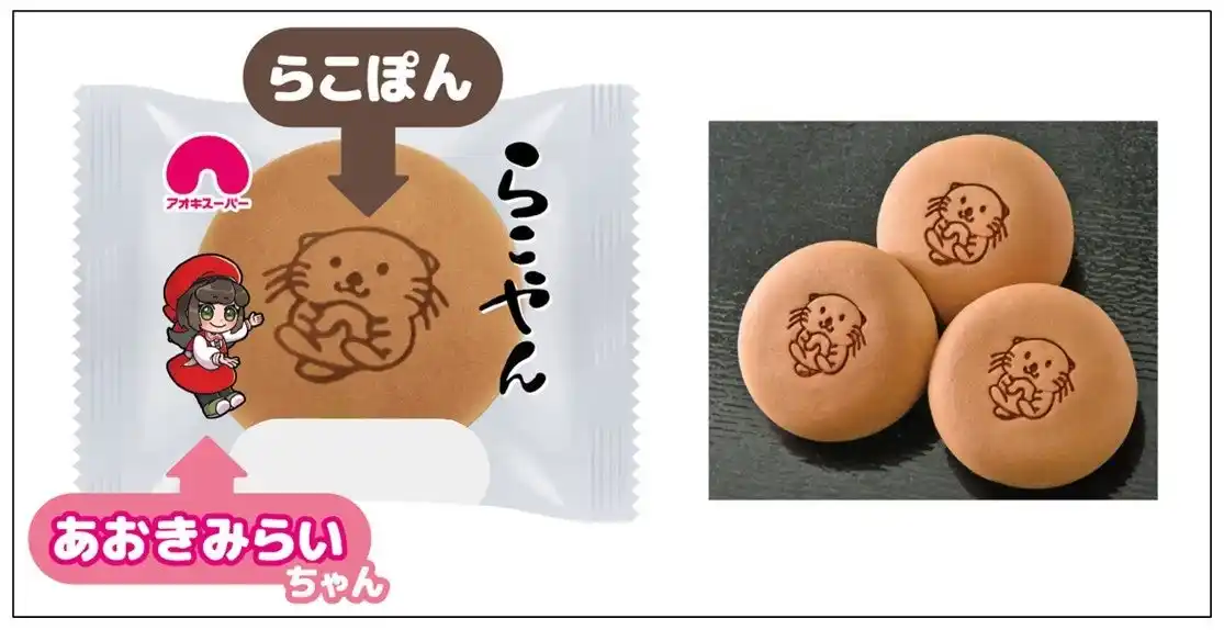 | 「小さな挑戦!大きな未来♪」・「未来の地球のために!今できることを♪」をテーマに様々な活動をしているアオキスーパーの公式キャラクター『あおきみらい』ちゃんと『らこぽん』(らっこ)をそれぞれパッケージと商品にデザインした可愛い和スイーツ | |||