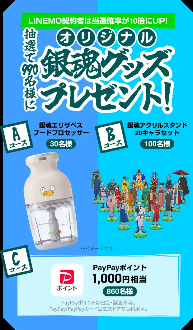 「LINEMO週穫祭」では、月替わりと週替わりのキャンペーンを実施し、LINEMOをいつでもおトクにご利用できる特典をご用意しています。2月4日(水)~3月1日(日)の期間中は、抽選でここだけでしか手に入らないオリジナル銀魂グッズが当たる「LINEMO週穫祭 銀魂総動員コラボキャンペーン第1弾」を実施します。銀魂エリザベスフードプロセッサー、銀魂アクリルスタンド20キャラセット、PayPayポイント1,000円相当が計990人に当たります。 |